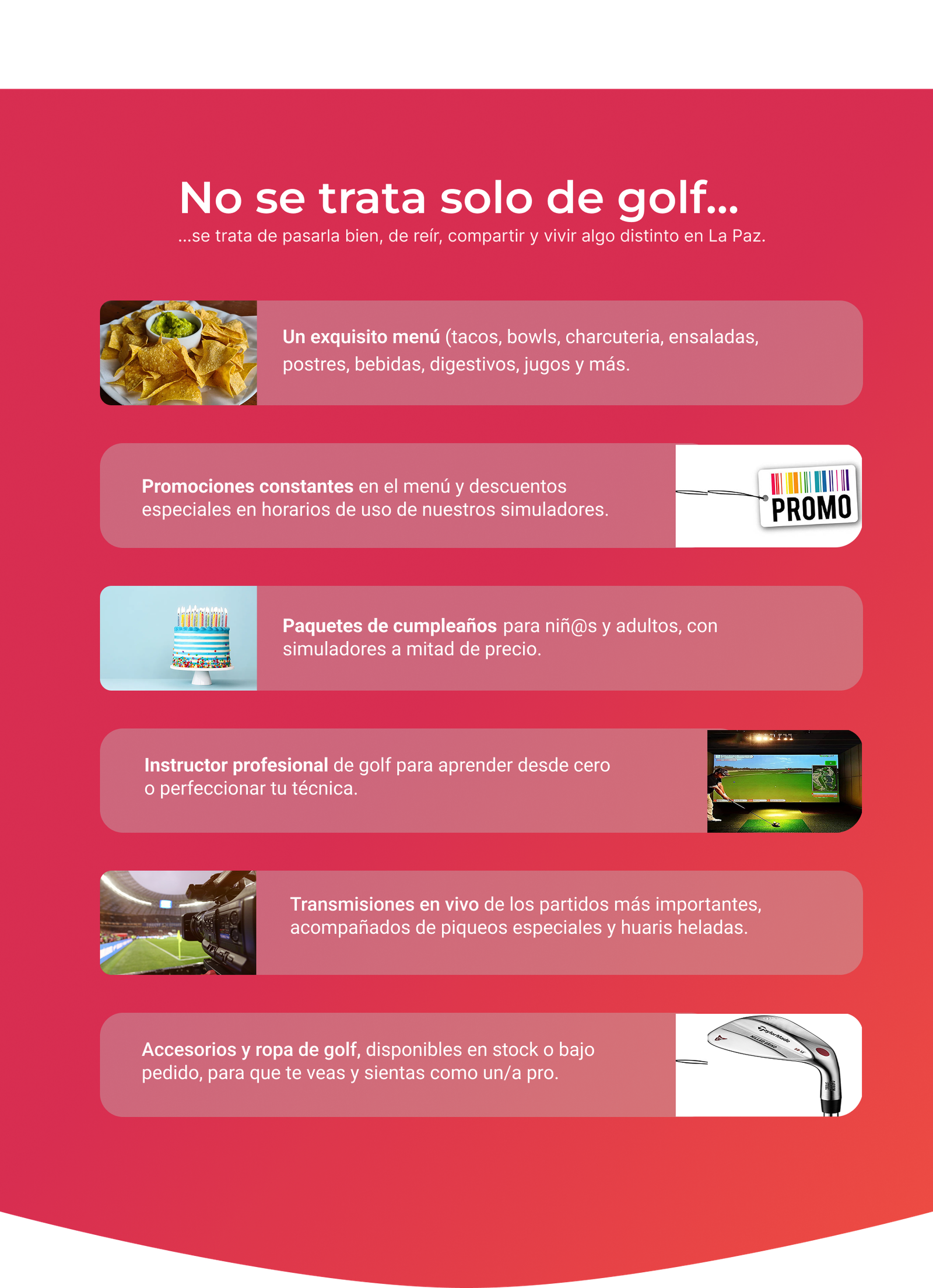 Practicar golf en interiores nunca ha sido mejor. Cada simulador está equipado con el software GSPro, que incluye 300 de los mejores campos del mundo, así como muchos campos locales. Cada simulador cuenta con varios programas de práctica que pueden grabar videos en vivo del cabezal del palo con repetición, y muestran con precisión todos los datos necesarios para llevar tu juego al siguiente nivel.